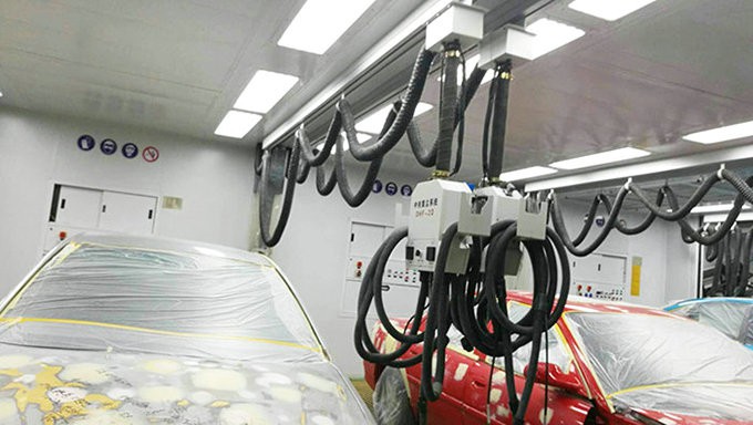 3、打磨房內利用移動烤燈,對工件膩子進行局部烘干;底漆房和中涂房配有三維頂部移動烤燈烘干,烤房內利用電加熱系統對工件進行整車進行烘干,烘烤時的較高溫度為 80℃。